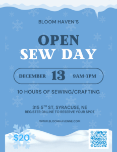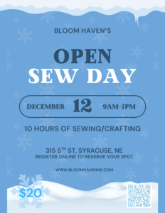 Join us for a 10-hour Open Sew on Saturday, December 13th, 2025! From 9AM – 7PM – Sew the day away and spend time catching up on one of the many projects you’ve been collecting… or get a jump-start on the new one you’ve been meaning to get to! We will provide you with your own […]